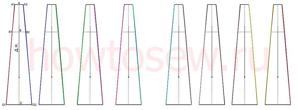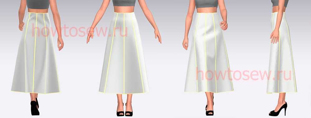 На рисунке ниже расклешенная юбка 8-клинка, отшитая из легкого, но не пластичного материала, швы выделены цветом для наглядности.