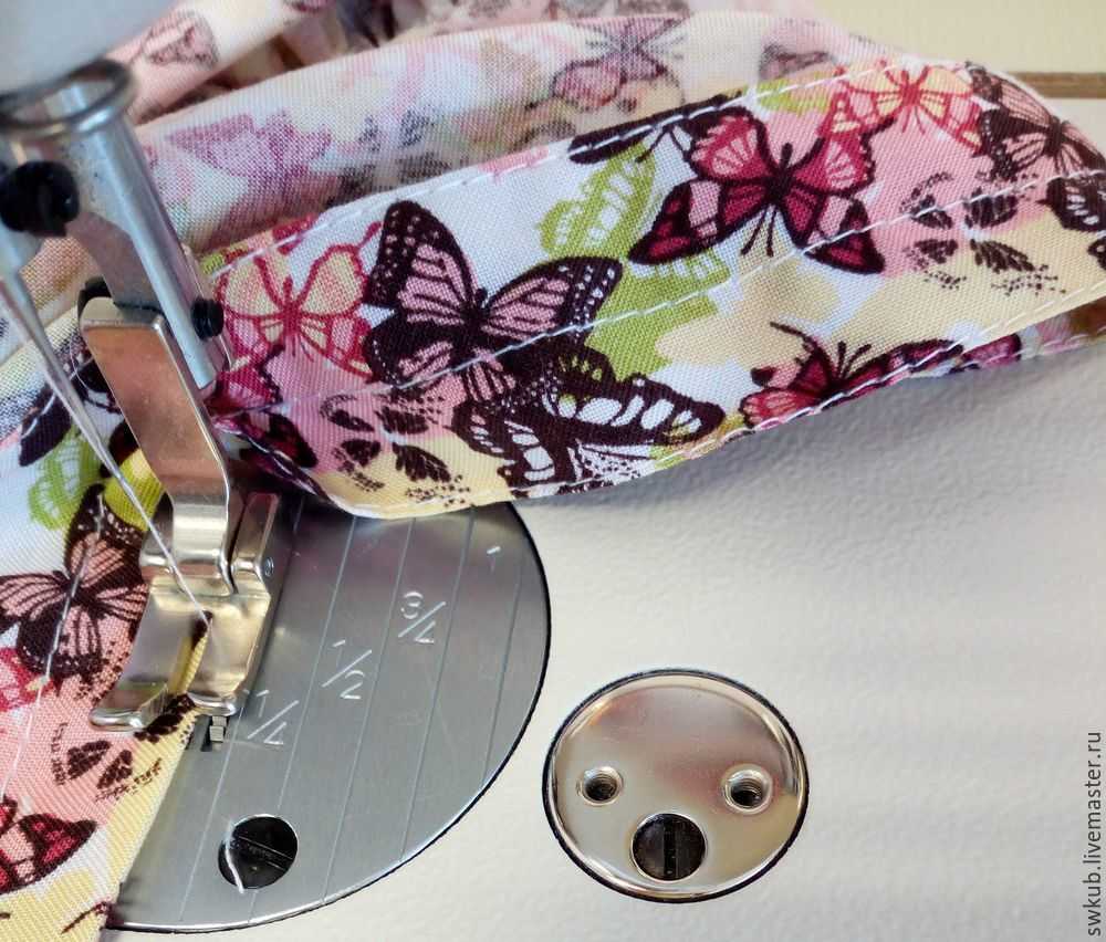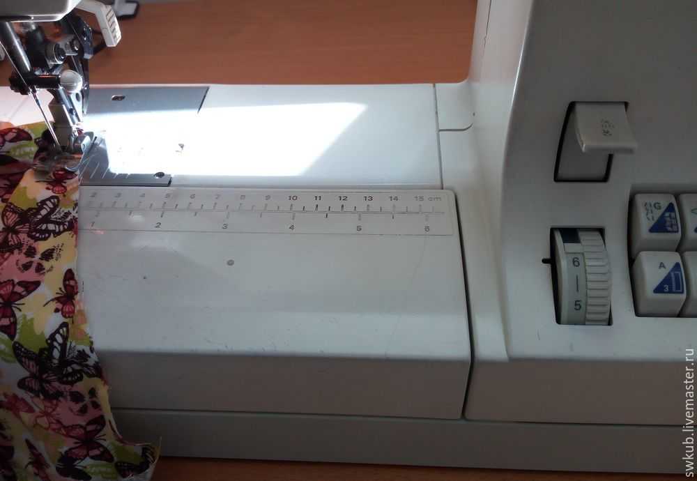 Затем нам нужно сделать сборку на оборке. Делаем это на швейной машинке. Выставляем самый длинный стежок и ослабляем натяжение верхней нити.