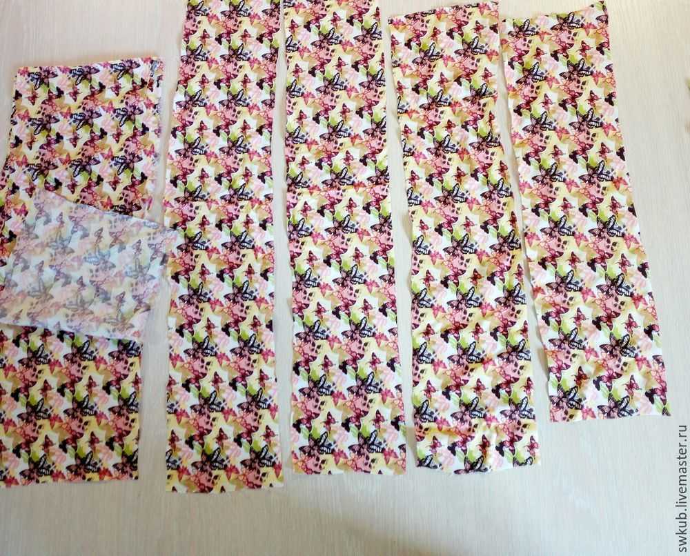 Чтобы получилась пышная, плотно собранная оборка, необходимо нарезать косые полоски в 3 — 4 раза длиннее готовой оборки, и в 2 раза шире. Не забудьте, что оборка складывается пополам.