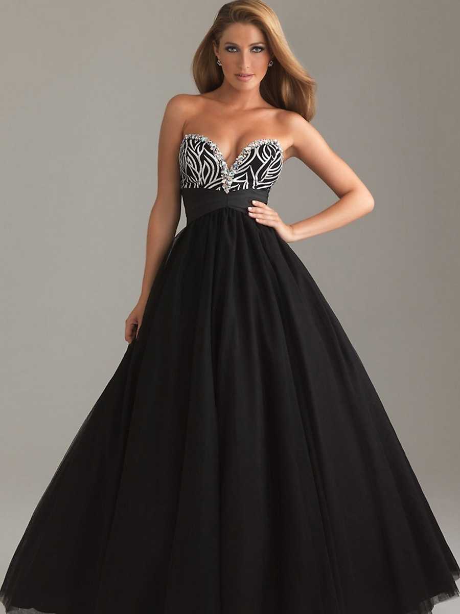 Черные вечерние платья выглядят еще более идеально в сочетании с закрытыми туфлями-лодочками на высоком каблуке. Такую обувь, особенно богато декорированную пайетками или стразами, выбирают для торжественного вечера. Если ноги устают, рекомендуется остановиться на варианте с небольшим и устойчивым каблуком. В теплое время года к платью надевают босоножки, но обязательно без колгот.