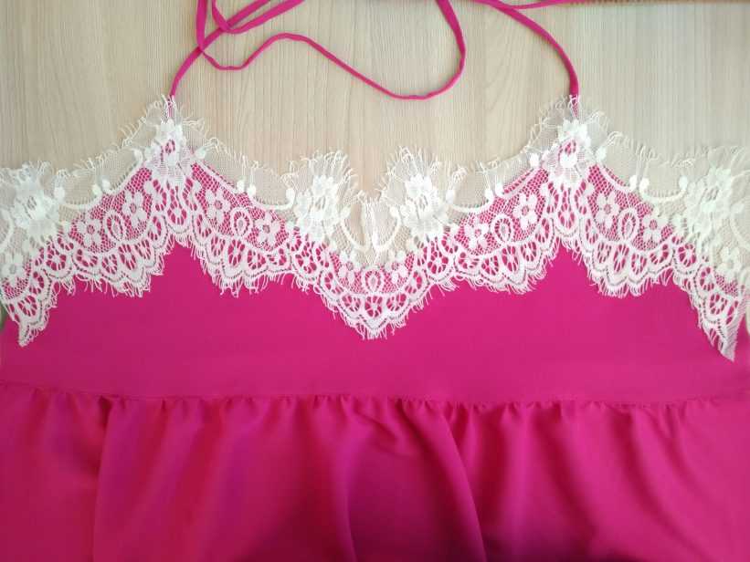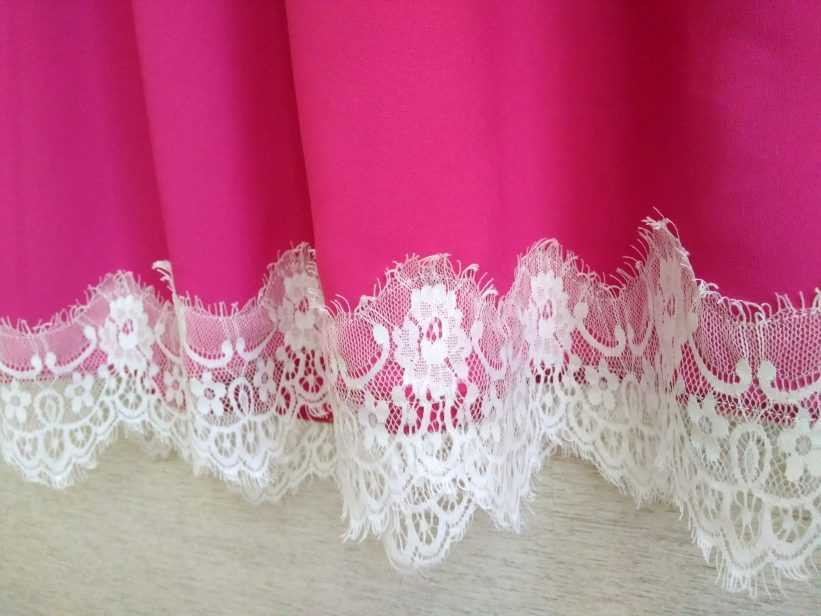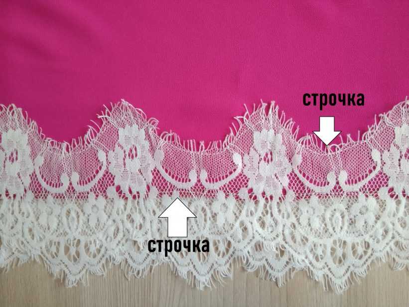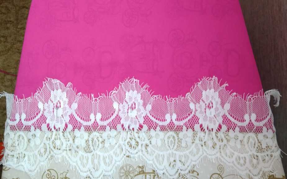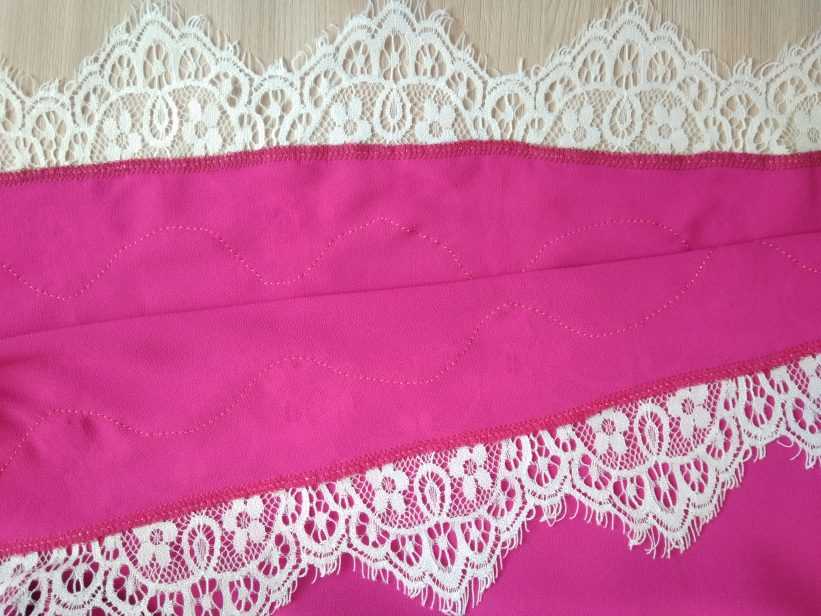 14. Спинку и полочку (перед) соединяю по боковым срезам. Низ сорочки обметываю на оверлоке. Накладываю кружево на нижний срез сорочки, креплю между собой булавками. Удобнее всего это делать на гладильной доске.