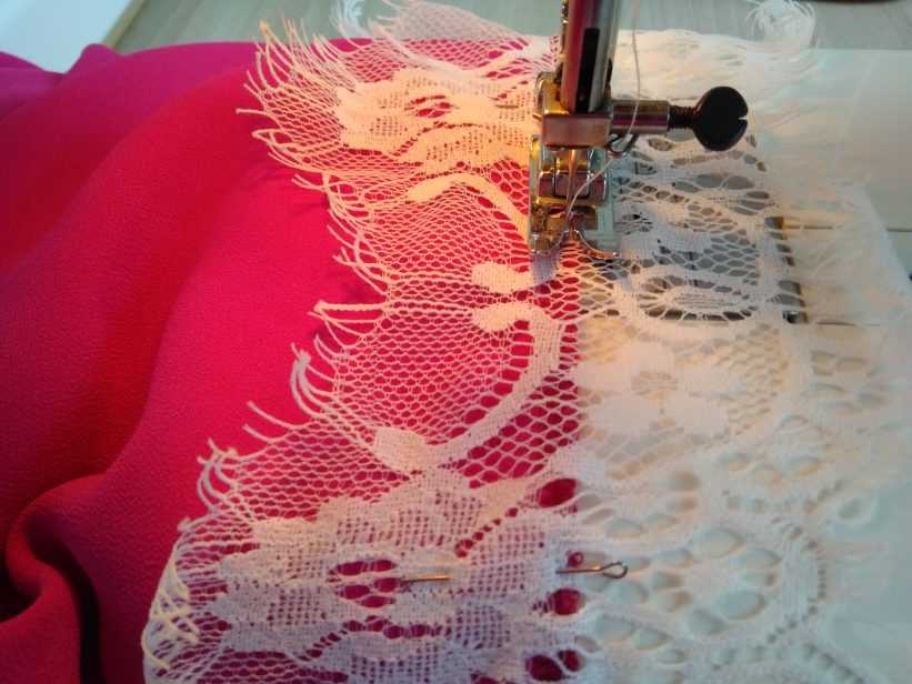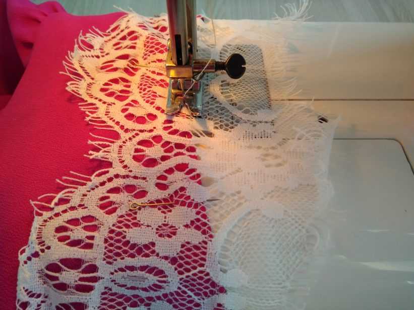 15. Нашиваю кружево к сорочке на швейной машинке прямой стачивающей строчкой.