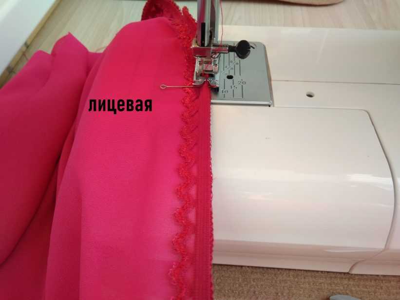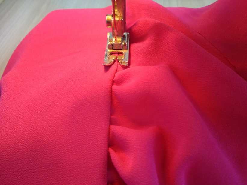 - Пристрочите рюш, разместив его в разрезе с изнаночной стороны. Загладьте швы.