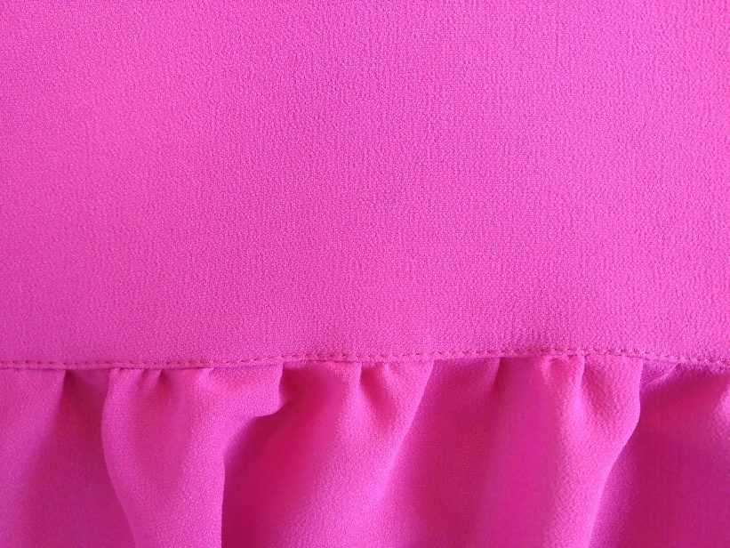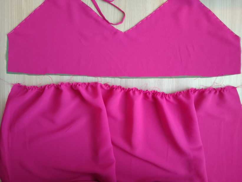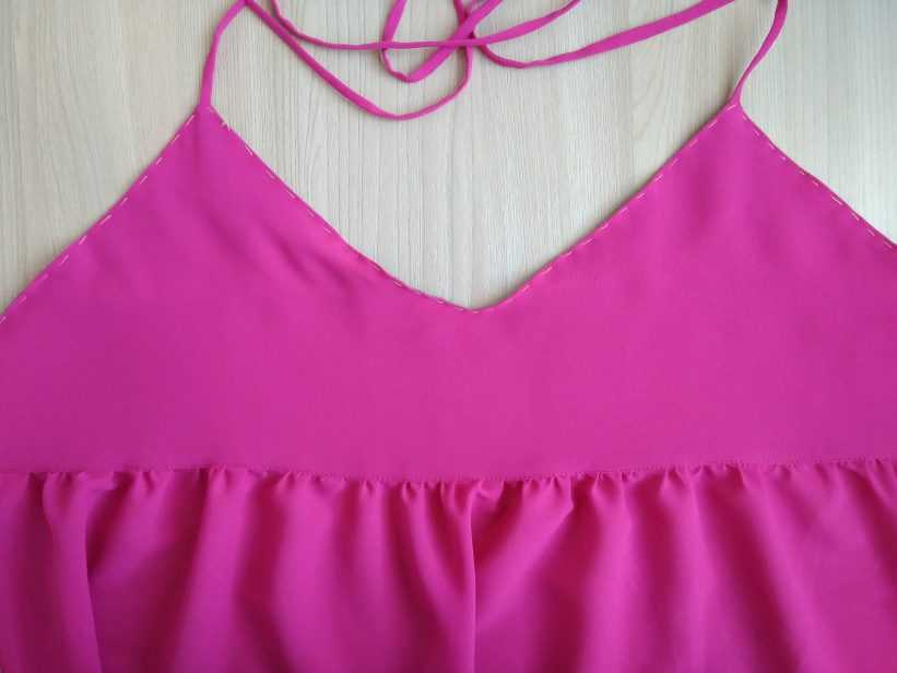 - Сложите детали переда и спинки лицевыми сторонами внутрь, стачайте и обработайте плечевые швы. Из-за рюша деталь переда немного короче детали спинки. Поэтому лишнюю ткань на спинке нужно срезать.