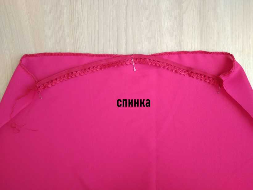 11. Обметываю верхний срез спинки на оверлоке. Беру резинку (она должна быть короче среза примерно на 5 — 7 см.), накладываю ее с лицевой стороны спинки, скрепляю булавками по центру и по боковым.