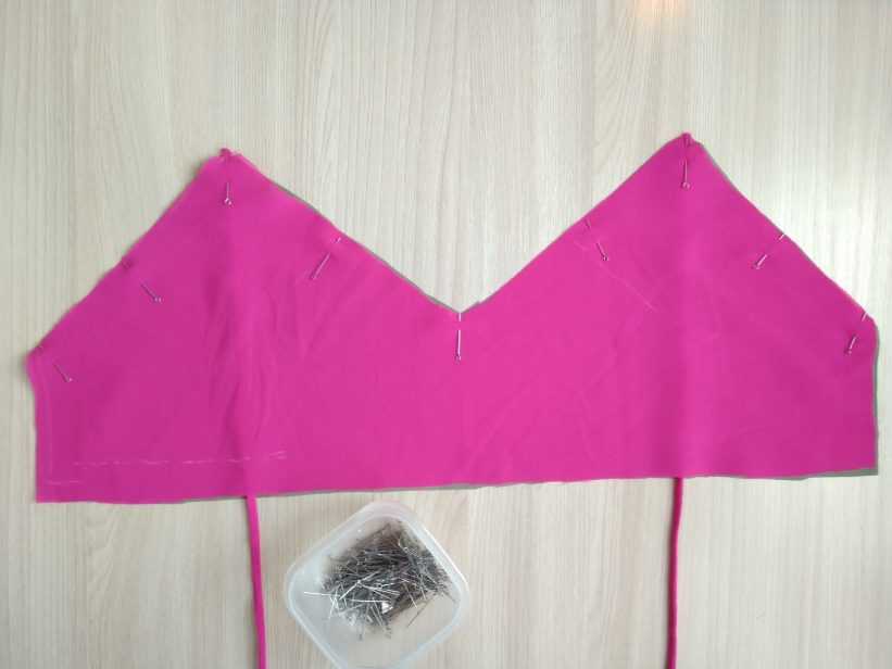 1. Прикрепляю портновскими булавками полученные лямки к лифу с лицевой стороны.