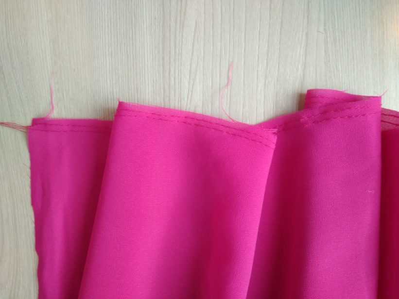6. Затем беру за два нижних конца ниток и одновременно за оба начинаю тянуть, как бы вытягивая нитку из ткани. У меня получается мелкое присбаривание. Это и есть мелкая сборка на ткани. Когда я соберу сборку на длину равную нижнему среза лифа, с обеих сторон завязываю концы ниток в узелки, чтобы строчка не распустилась.